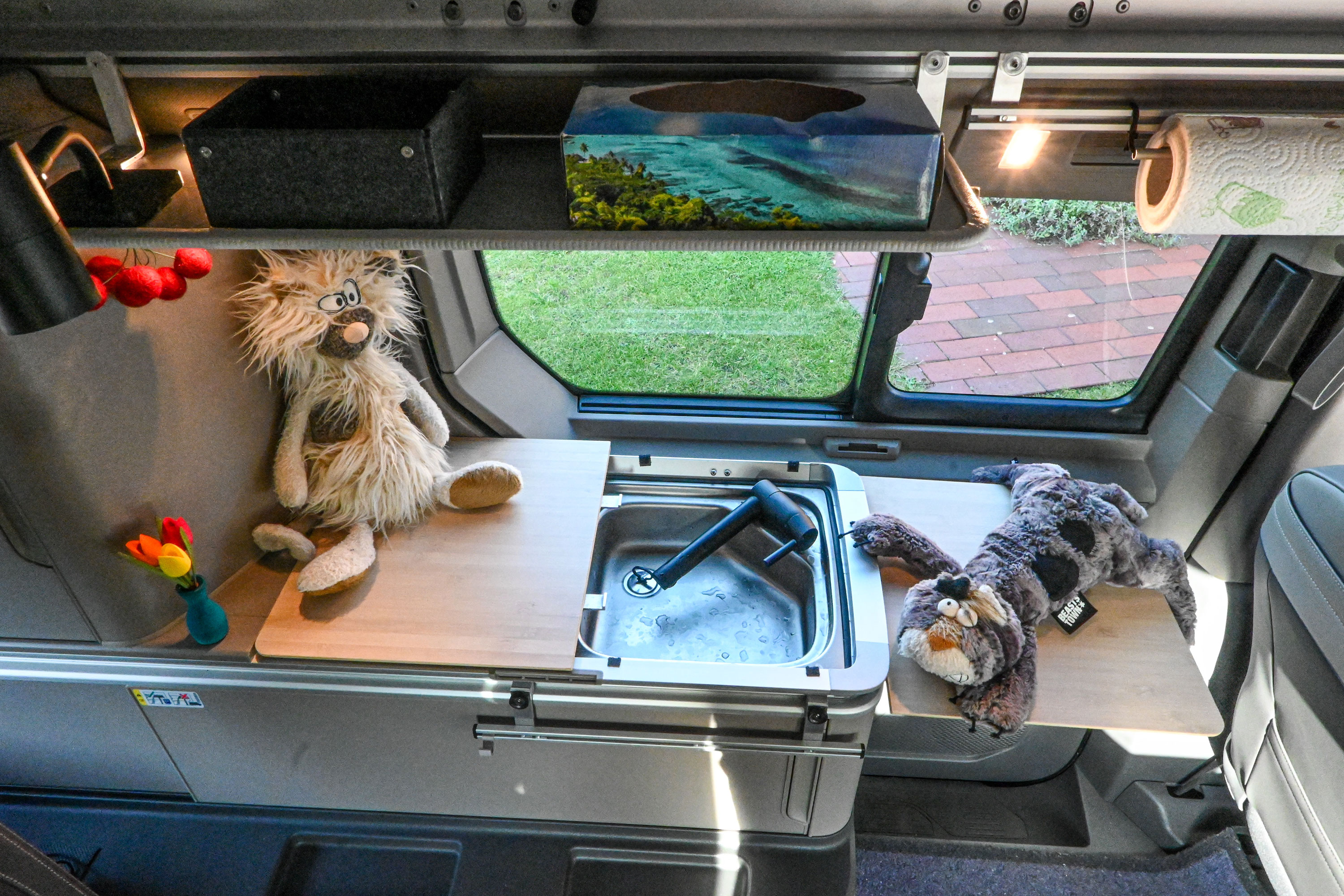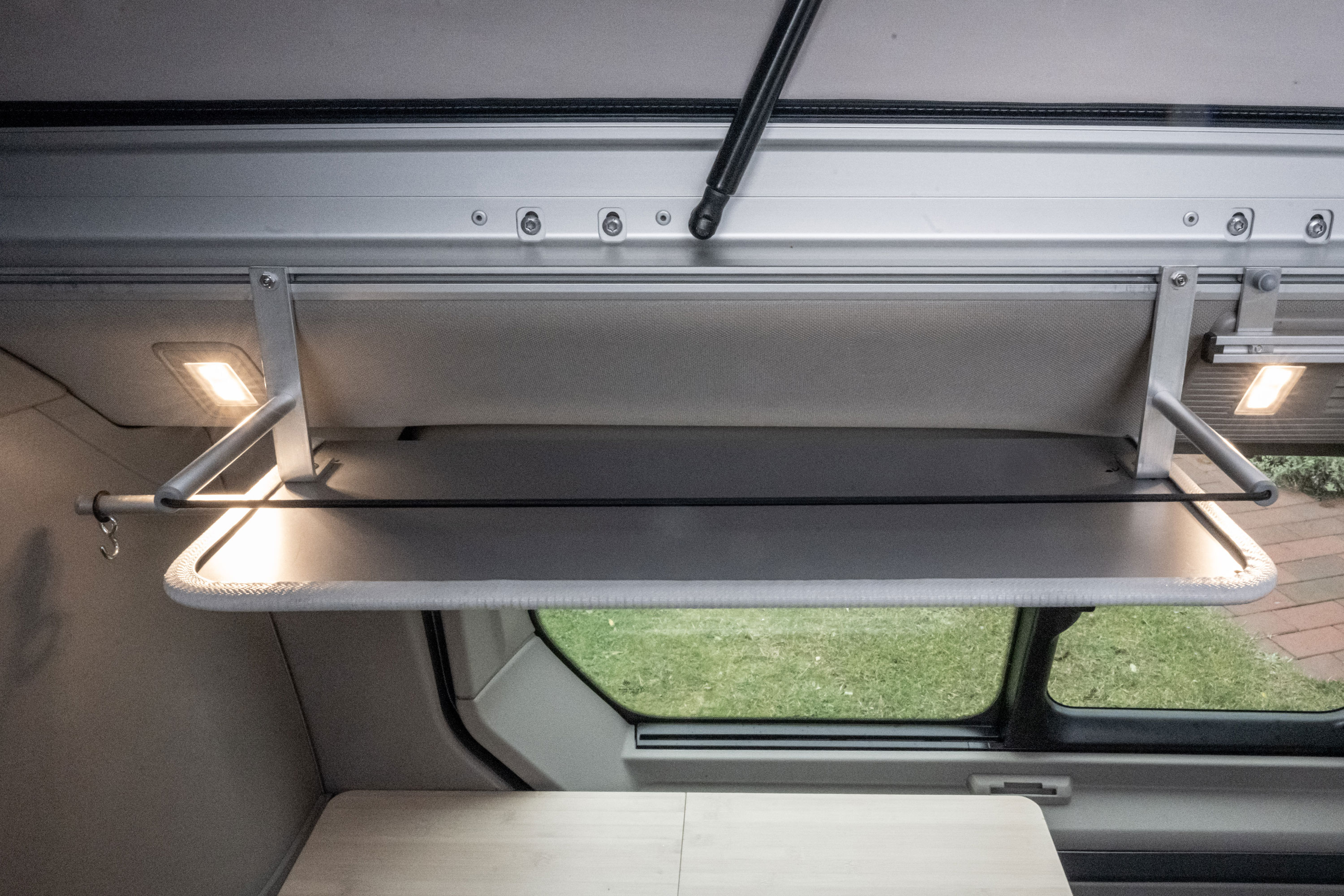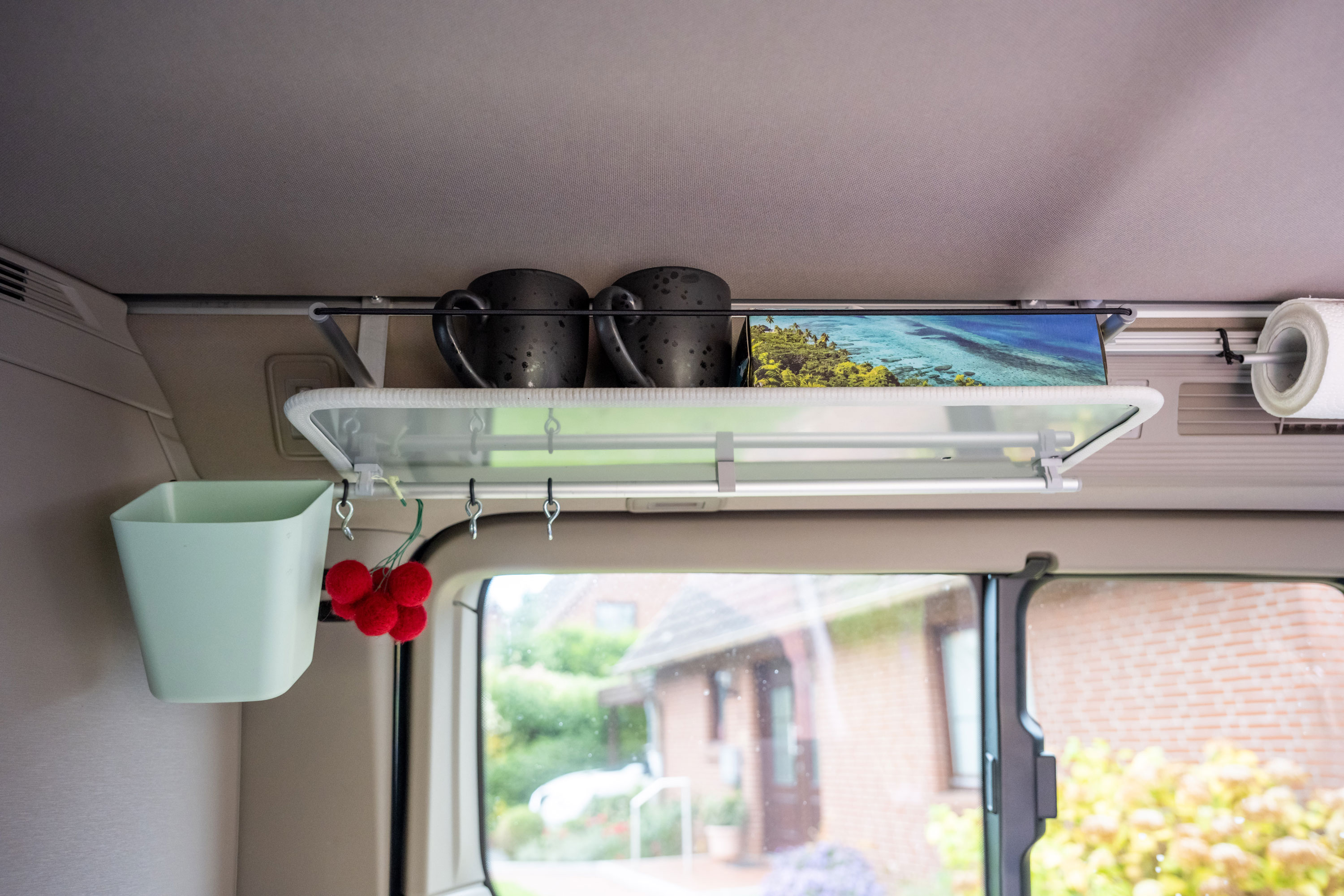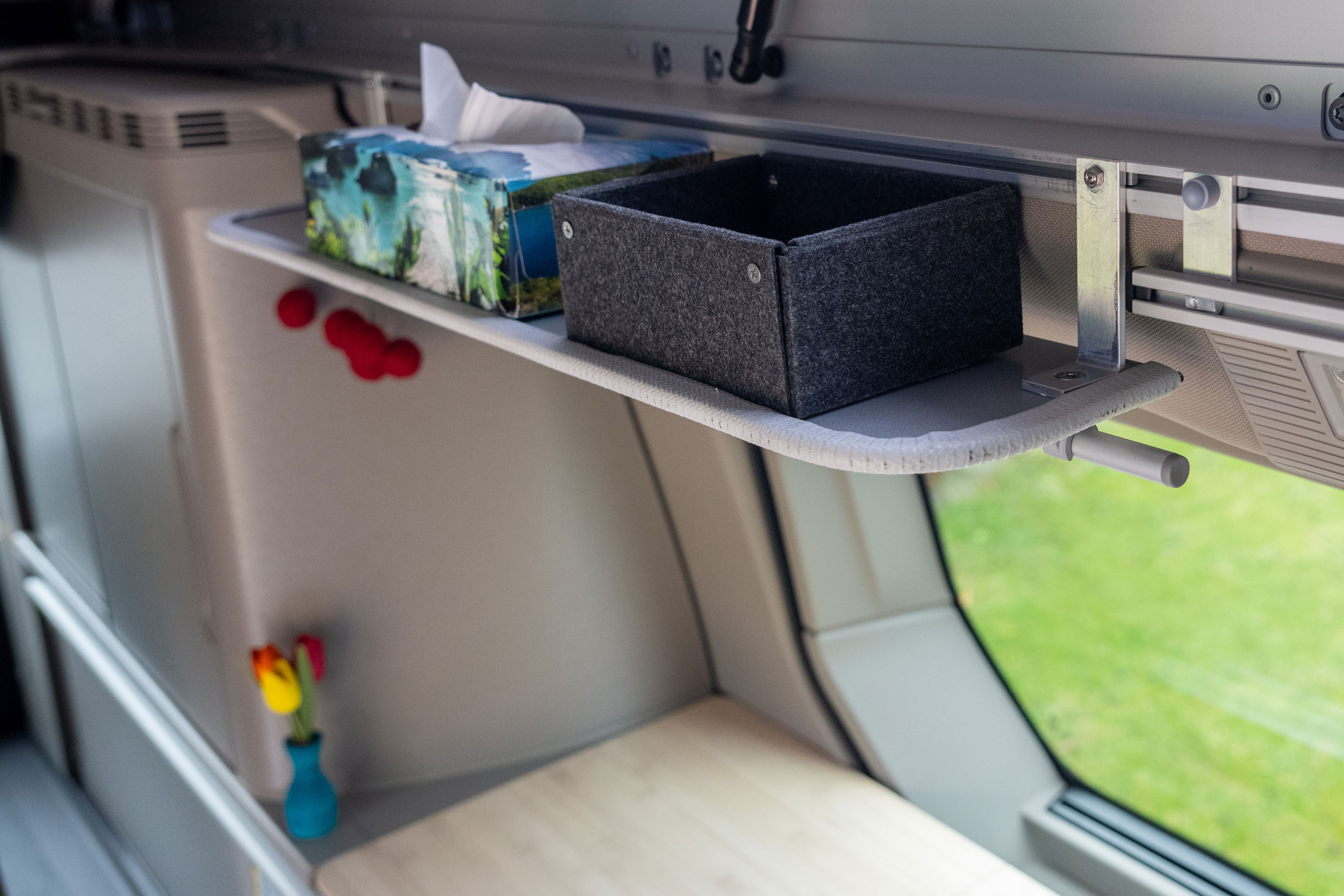 Das Regal ist fast bündig mit dem Schrank, das niedrigere tiefere Regal ragt etwas über diesen hinaus – für spürbar mehr Ablagefläche und praktischen Zusatzraum im Camper.