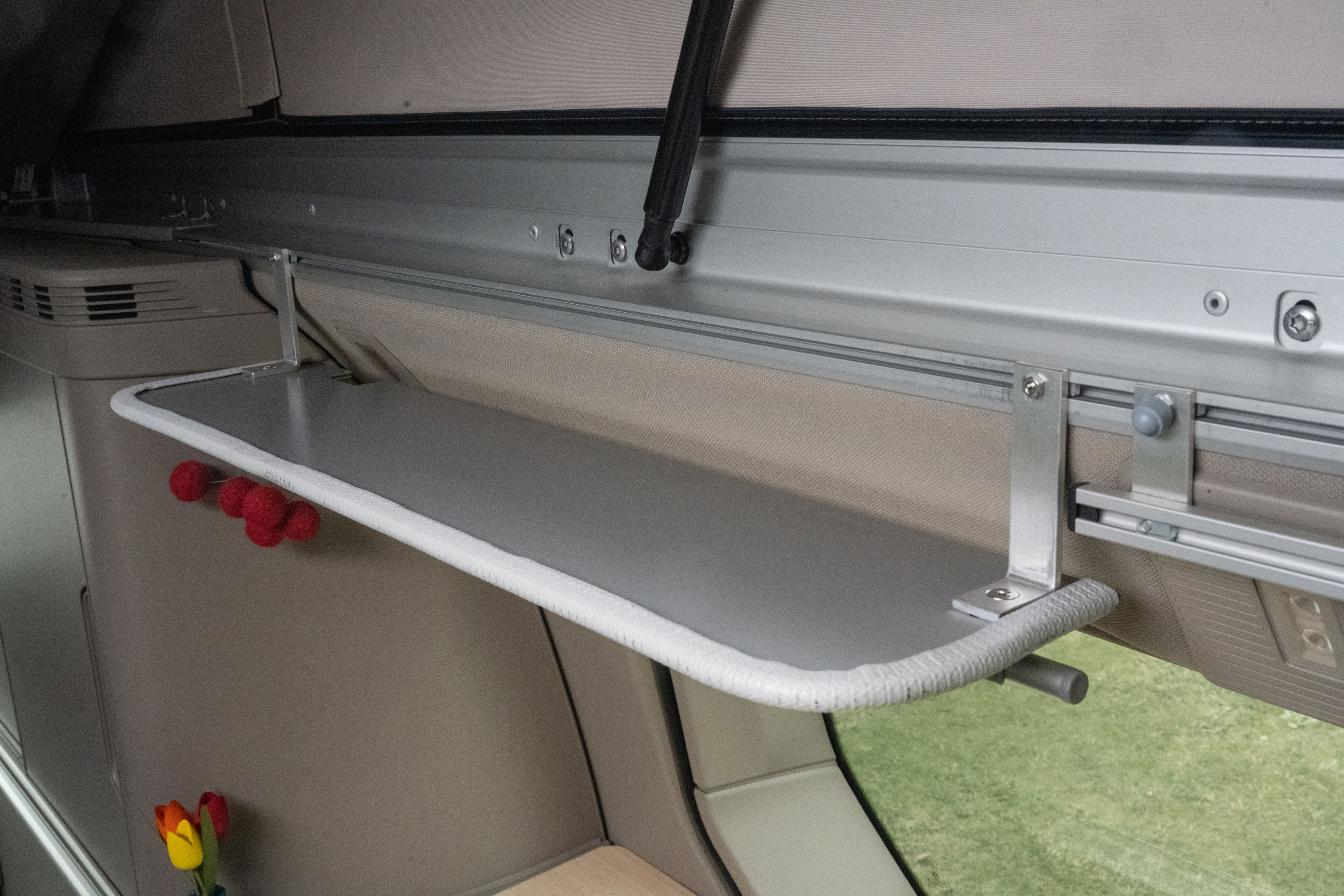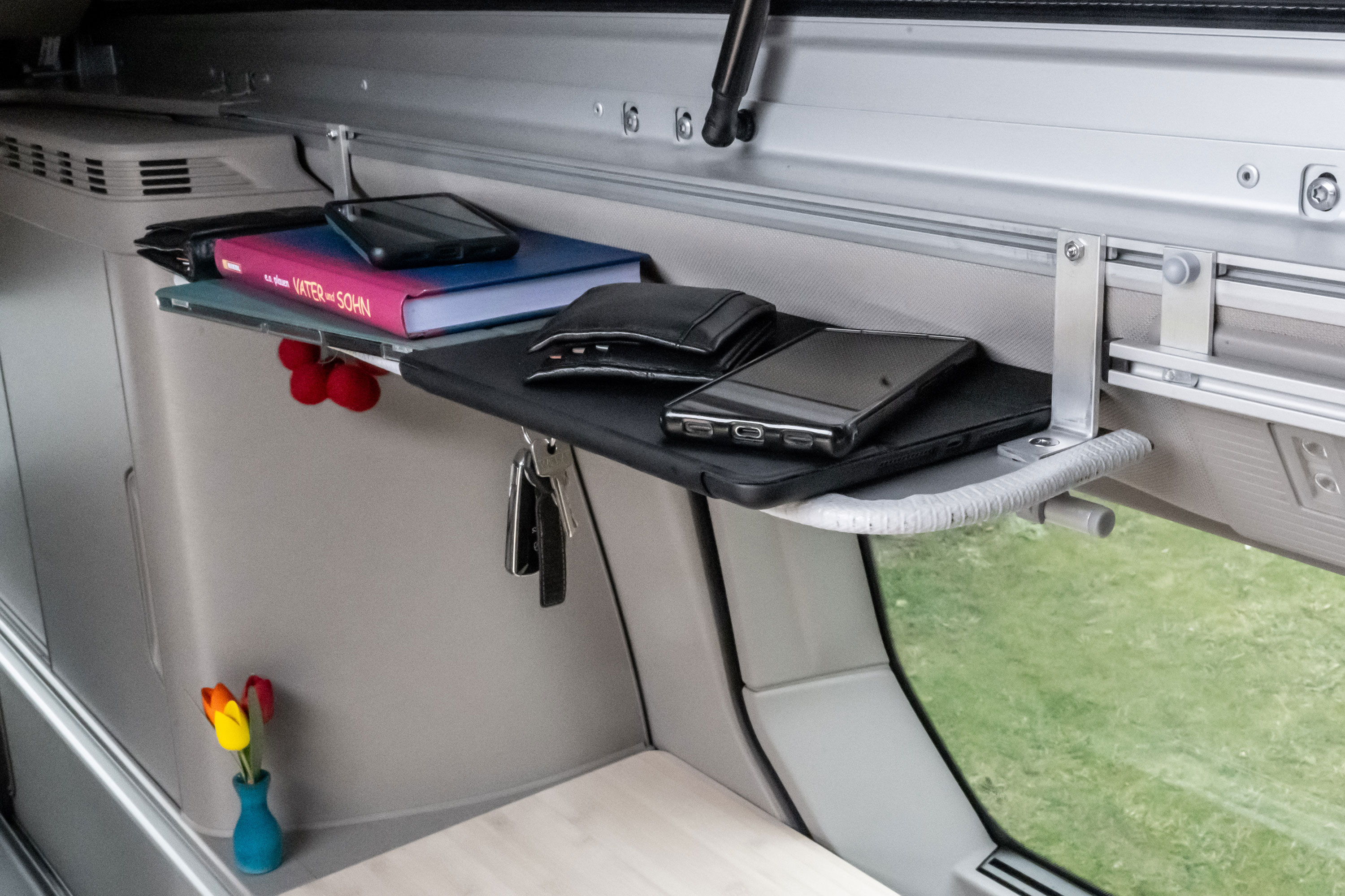 Gefertigt aus hochwertigen Materialien und ausgestattet mit passgenauen Halterungen, fügt sich das Seitenregal harmonisch in das Interieur deines California ein.