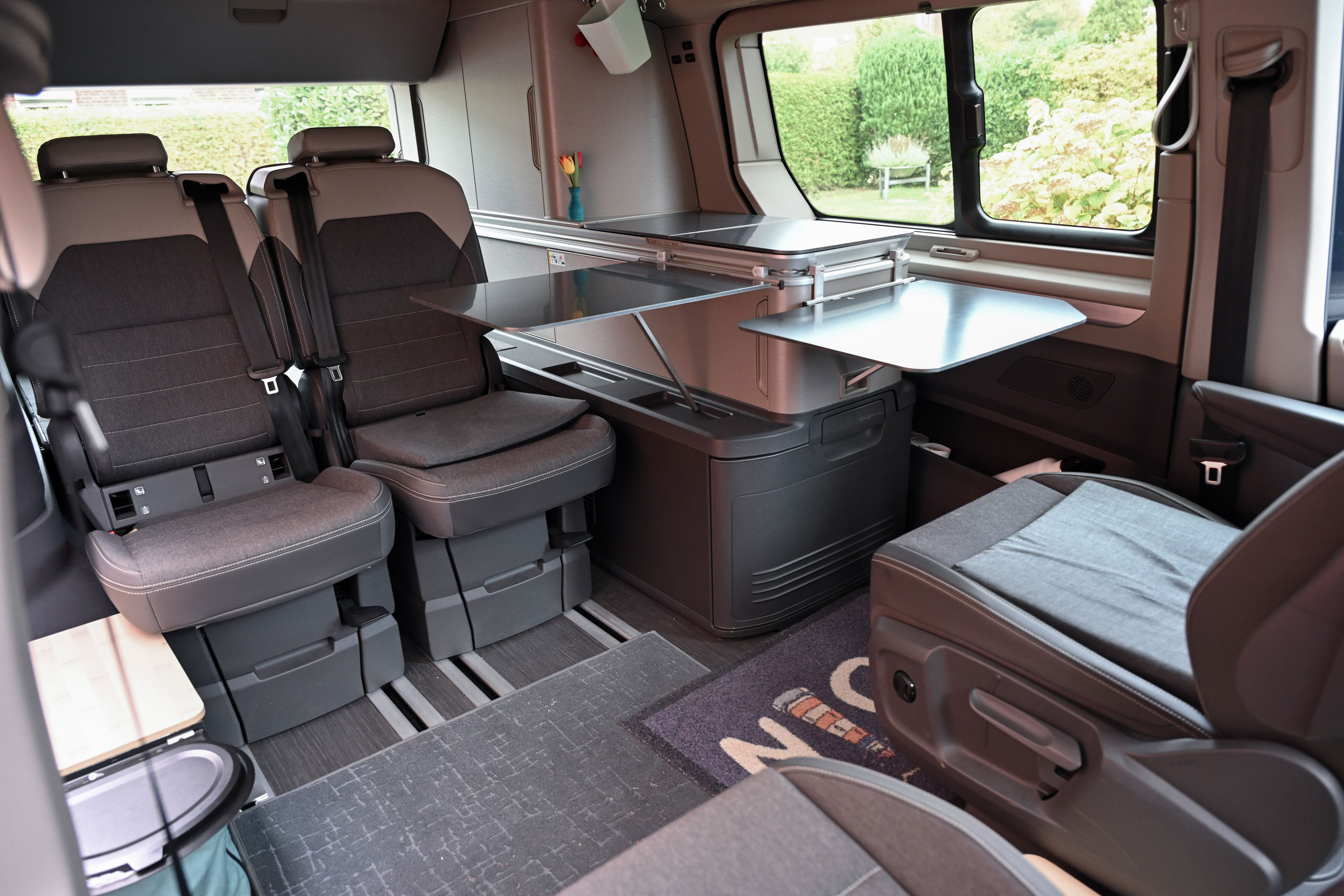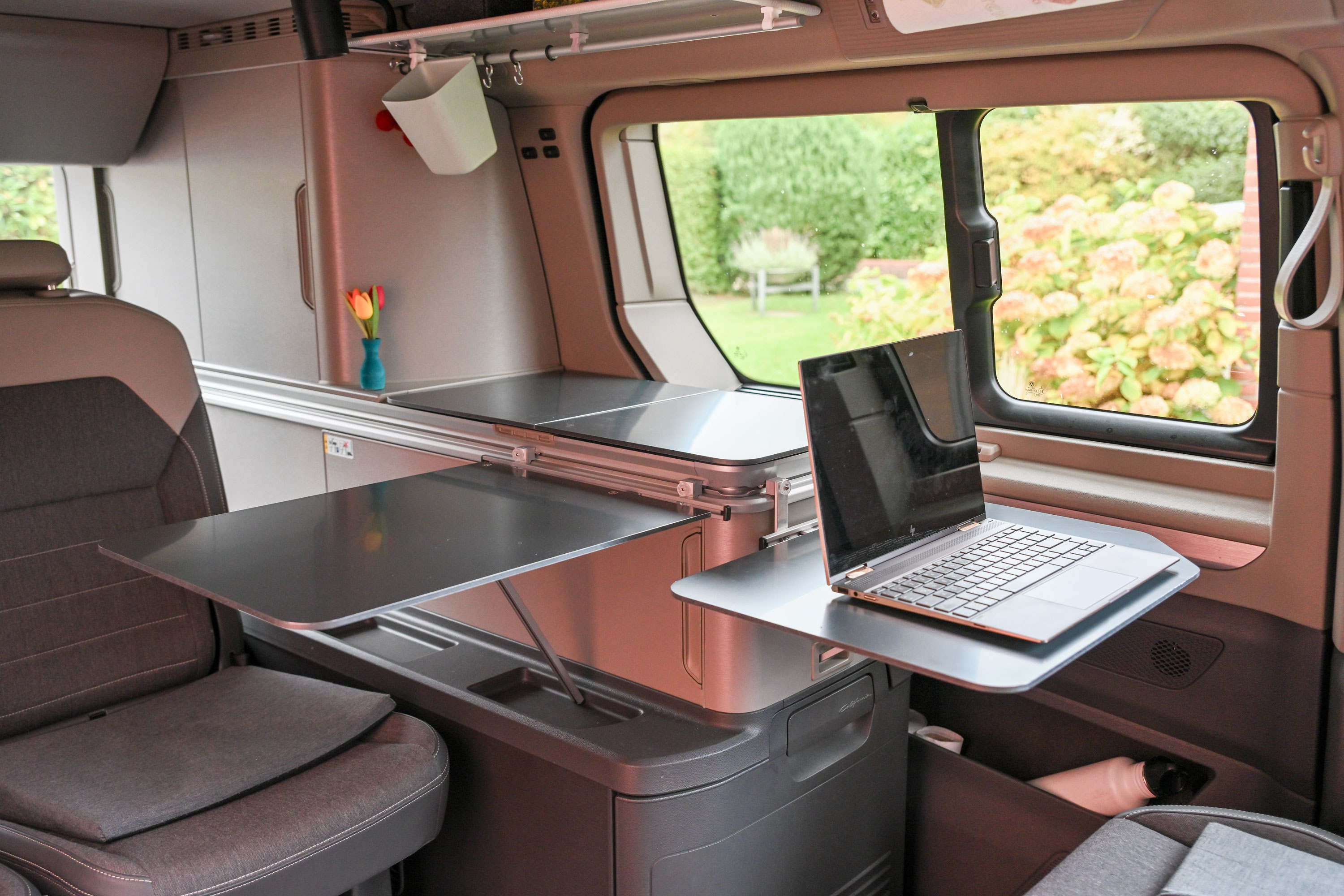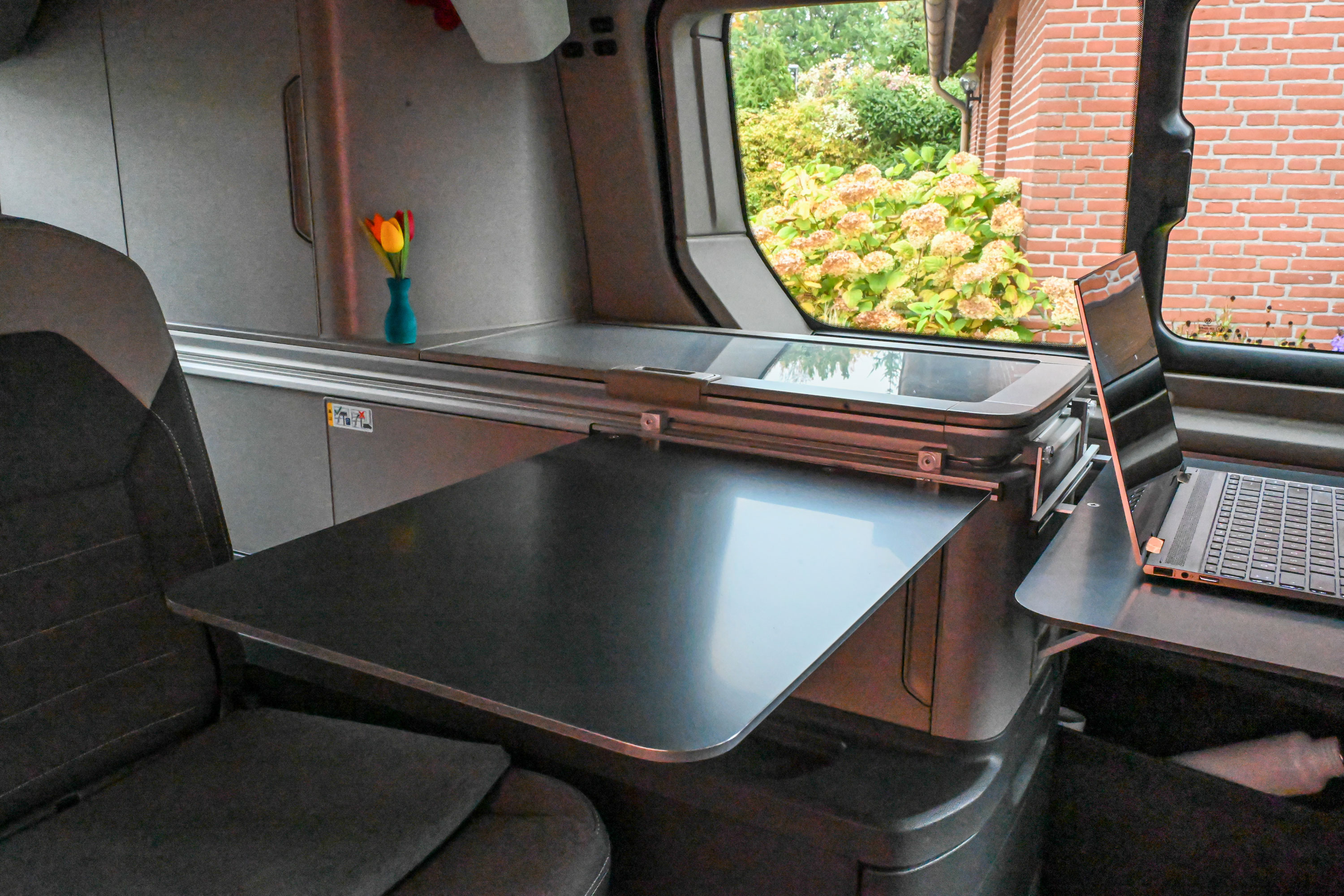 Leider fehlt dem neuen California ein Innentisch wie du ihn vielleicht vom alten California kennst. Der kleine Tisch an der Küche ist leider kein vollwertiger Ersatz, da er nur für eine Person zum Essen oder Arbeiten geeignet ist.