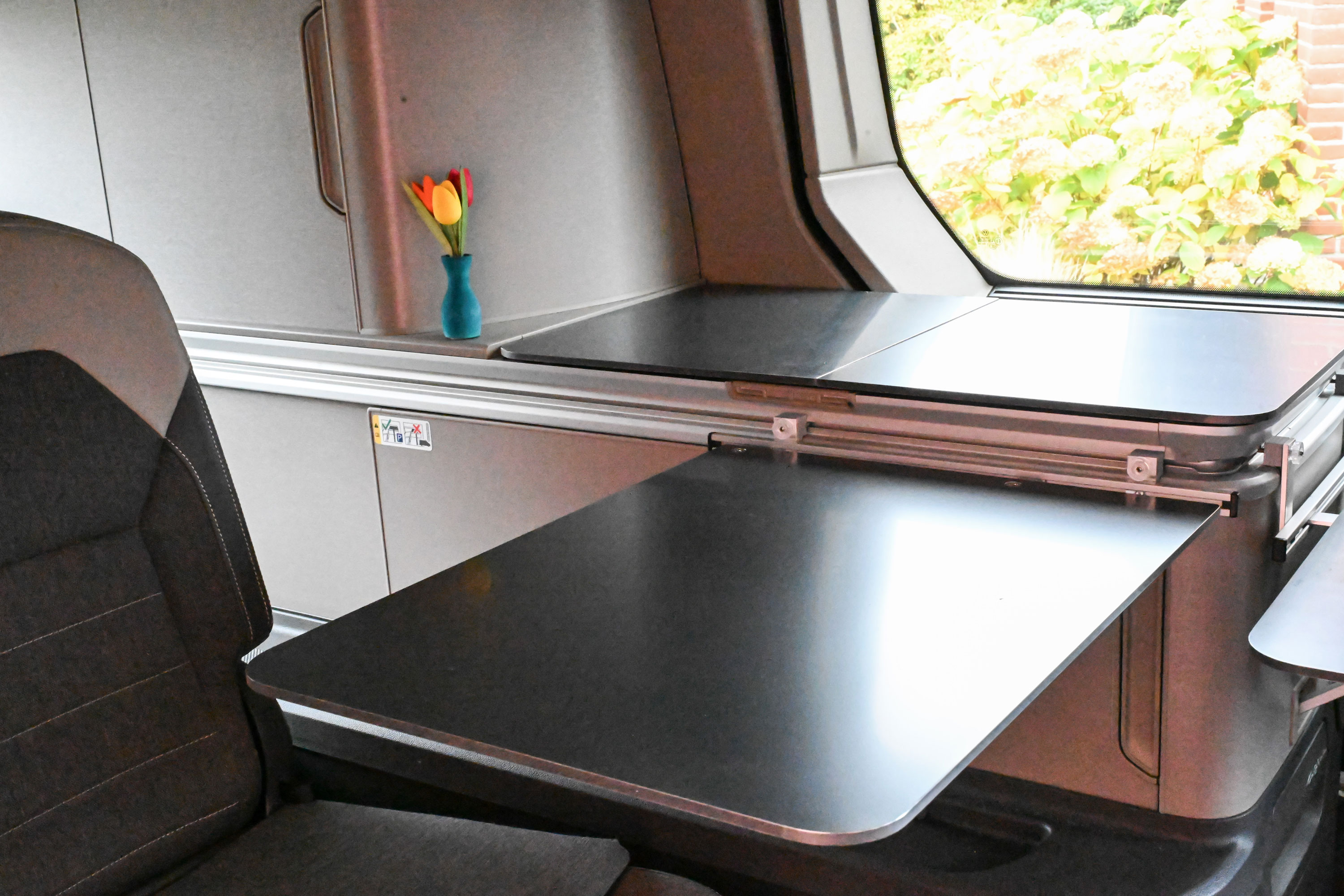 Der Innentisch wird wie der Originaltisch in die Originalschiene eingeschoben und erweitert den Küchenblock. Die Tischplatte wird mit der Stützstange abgestützt. Der Innentisch ist so konstruiert, dass du gut vom Fahrersitz oder vom Rücksitz an ihm essen oder arbeiten kannst.