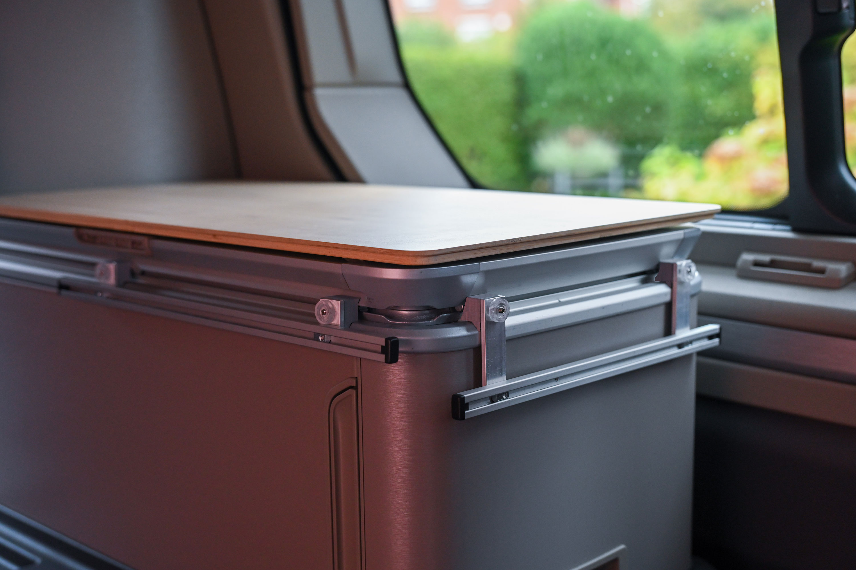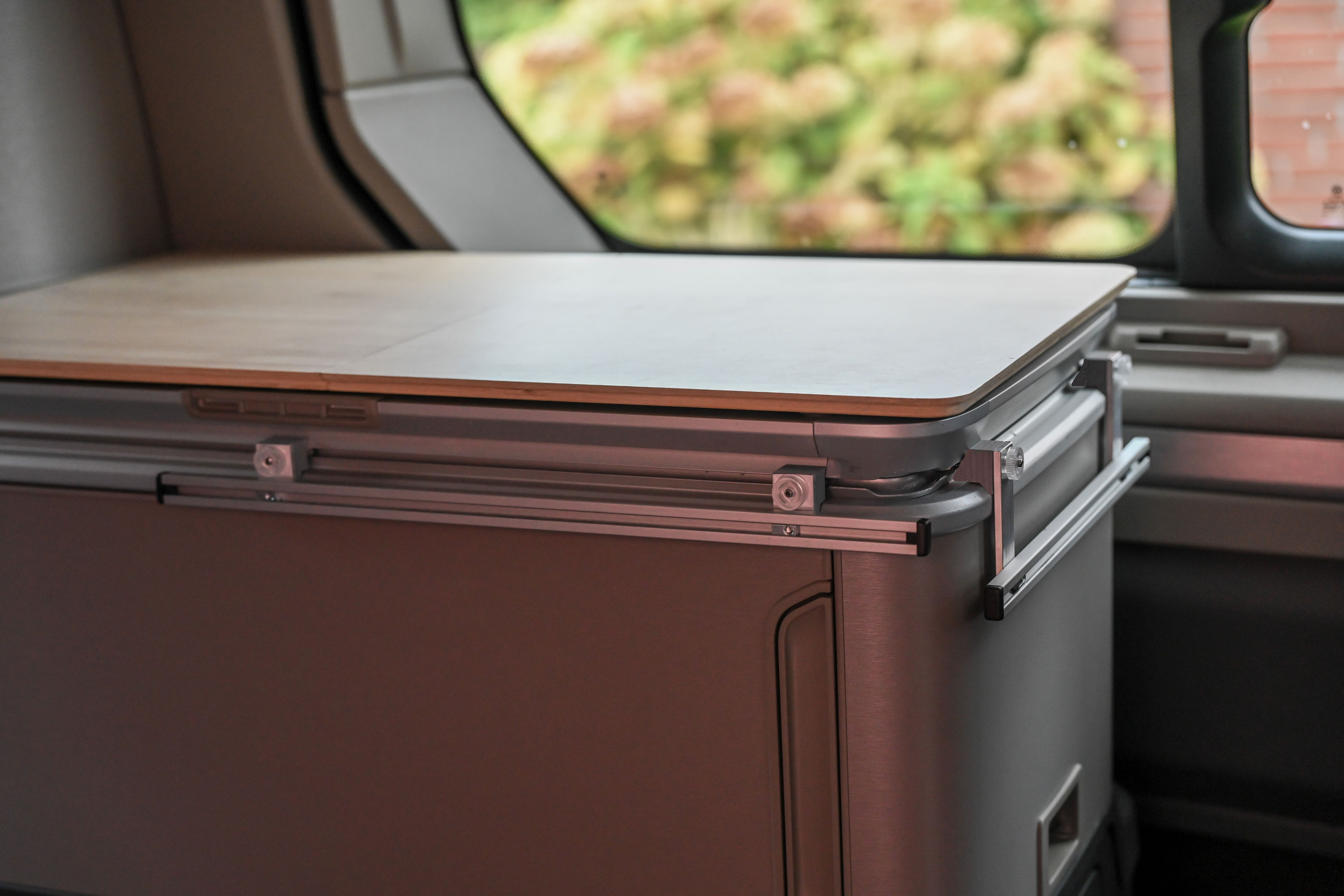 Mit einer Tischhöhe, die rund 2 cm niedriger als beim Originaltisch ist, fügt sich diese Lösung optisch perfekt in das moderne Innenraumdesign des neuen California ein. Alle Schränke und die Besteckschublade bleiben vollständig nutzbar.